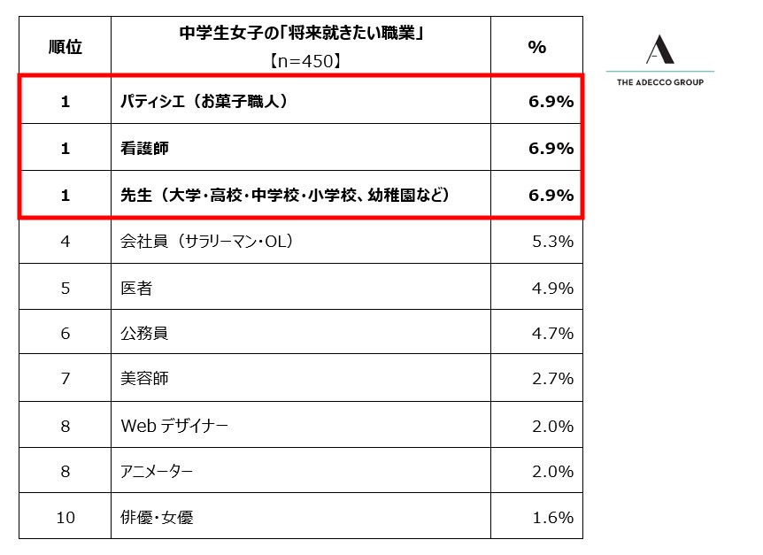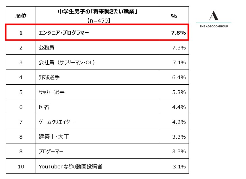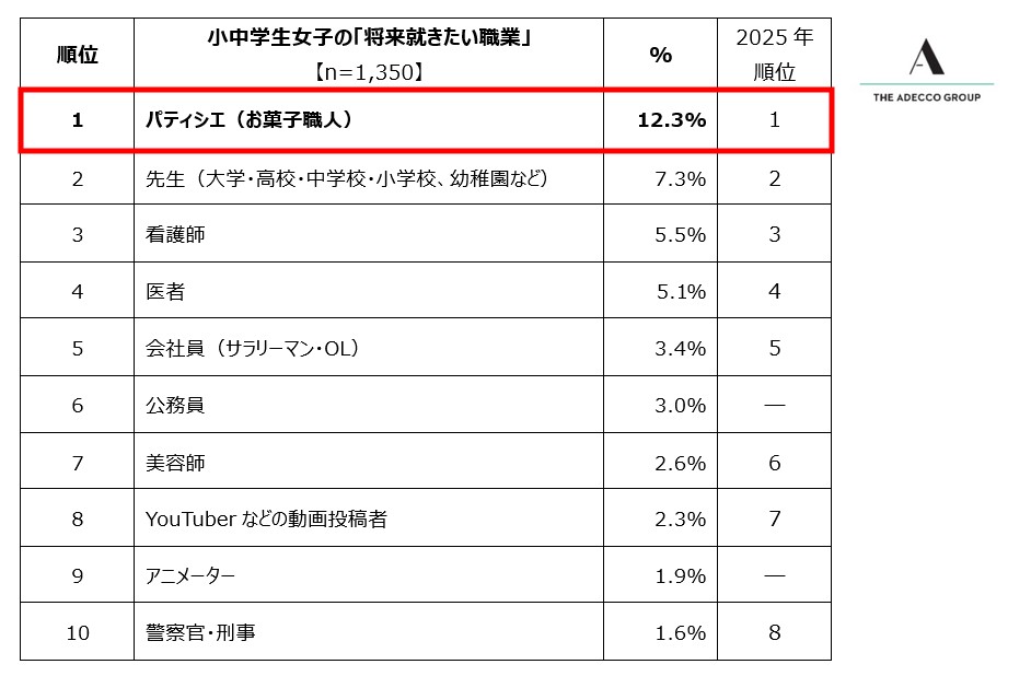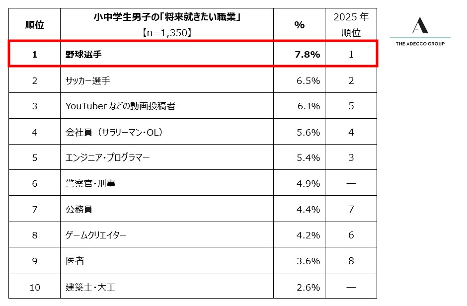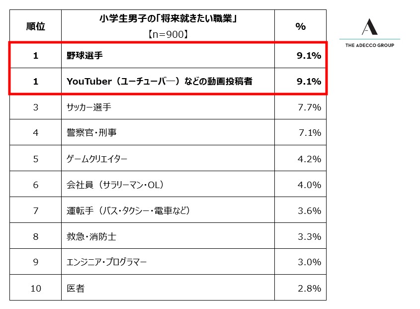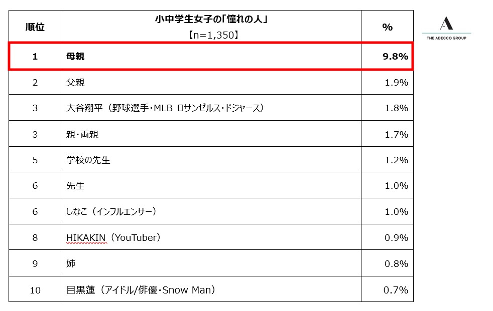 人財サービスのグローバルリーダーであるAdecco Groupの日本法人で、総合人事・人財サービスを展開するアデコ株式会社(本社:東京都千代田区、代表取締役社長:平野 健二)は、この度、日本全国の小中学生2,700人(各学年男女150人ずつ)を対象に、「将来就きたい職業」と「憧れの人」に関する調査を実施しました。「将来就きたい職業」は単一選択式、「憧れの人」は単一自由回答式とし、それぞれ回答を収集しました。