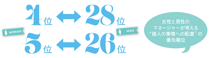 日本の職場における人財の多様性は外形的には進んでいる。しかし、その能力が十分発揮できていないのが課題だ。その原因の1つを示すのがこちら。男女のマネージャー間での認識のギャップを見てとれる。「女性活躍にとどまらず、コミュニケーションと相互理解がD&Iに欠かせません。女性から求められているのは比較的コストのかからないものばかり。有効な施策を取り入れるためにも、こうした声を経営層がしっかり吸い上げる仕組みも大切です」