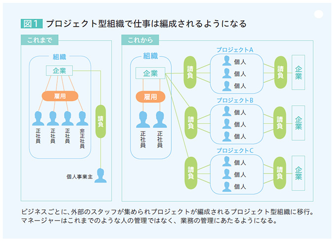 「もはや企業が大きなピラミッド型の組織を抱える必要はなくなるでしょう。機動性を高めるためにも、抱える社員を最小限にして組織をスリム化し、プロジェクトごとに必要なメンバーを社内外から招集して成果を生み出していく『プロジェクト型組織』(図1参照)に変わっていくと考えられます」(大内氏)