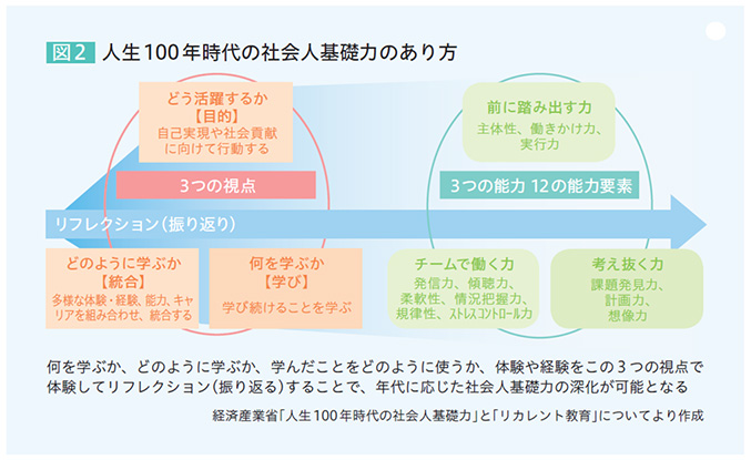 経済産業省が2018年3月に公開した『我が国産業における人材力強化に向けた研究会報告書』では、人生100年時代に個人が求められる能力や資質についてまとめている。同省は2006年に、①前に踏み出す力、②考えぬく力、③チームで働く力の3つを『社会人基礎力』として提唱した。今回の報告書では、これらの力を自分の年代などに合わせてブラッシュアップしていくことの重要性が強調されている。