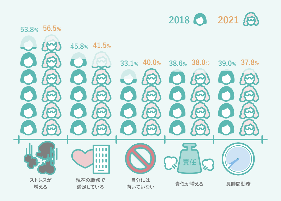 「昇進・昇格したくない」と回答した547名を対象に、その理由を調査したところ、最も多かった回答は「ストレスが増えるから」(56.5%)、次いで「現在の職務で満足しているから」(41.5%)、「自分には向いていないから」(40.0%)の順に多い結果になりました。2018年と比較すると、1、2位の項目に変動はありませんが、2018年には5位だった「自分には向いていないから」が、2021年では3位に上昇しています。