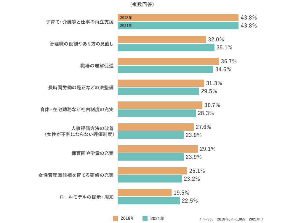 管理職になる女性を増やすために必要なことについて聞いたところ、「子育て・介護等と仕事の両立支援」(43.8%)が最も多く、続いて「管理職の役割やあり方の見直し」(35.1%)、「職場の理解促進」(34.6%)の順に多い結果になりました。2018年の結果と比較すると、「管理職の役割やあり方の見直し」が3位から2位に上昇し、必要性が高まっていると感じていることがわかりました。