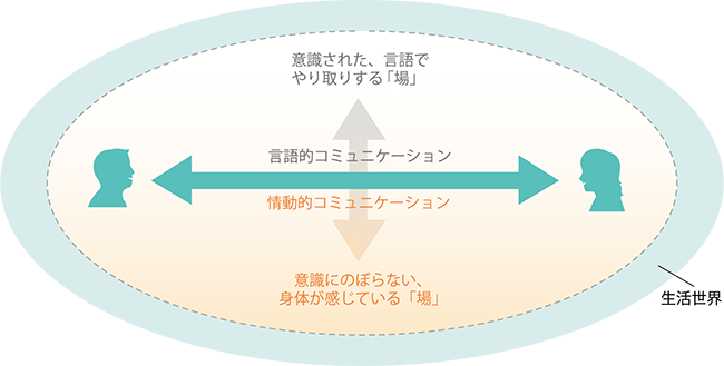 コミュニケーションには言語的コミュニケーションと情動的コミュニケーションの2種類があるが、身体で発し、身体で感じる情動的コミュニケーションが「場」においては重要な要素となる。