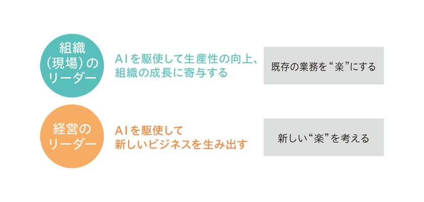 組織のリーダーとは異なり、経営のリーダーには新しいビジネスを生み出すことが求められる。AIは必須であり、とにかく慣れるまで使い続け、恐れや不安をなくすことが大事だ。