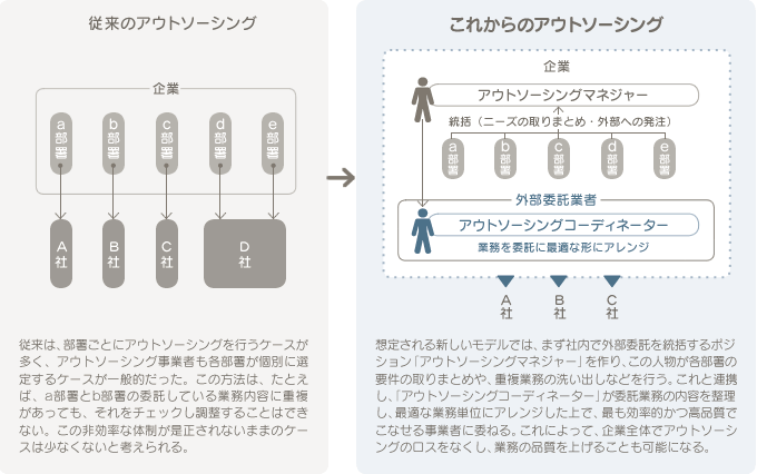 従来は、部署ごとの要請で個別に外部委託していた業務を、まず取りまとめます。同時に、外部委託している業務を統括する「アウトソーシングマネジャー」というポジションを作り、上記で取りまとめた委託業務全体をそのマネージャーが見通せる仕組みを作ります。次に、外部の「アウトソーシングコーディネーター」と協力して、各業務をどう外部事業者に委ねるかを検討していきます。