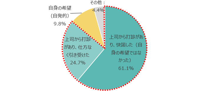 管理職になったきっかけとして、回答者の61.1%が「自身で希望していなかったが、上司からの打診があり、快諾した」、24.7%が「上司から打診があり仕方なく引き受けた」と回答しており、自ら自発的に希望するのではなく、上司からのはたらきかけをきっかけに管理職になっている人が8割以上であることがわかりました。