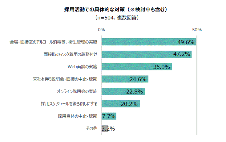 また、「対策を実施している」、「対策を検討中」、「これから対策を検討する」と回答した504名を対象に、実施・検討している具体的な対策について聞いたところ、「会場・面接室のアルコール消毒等、衛生管理の徹底」(49.6%)、次いで「面接時のマスク着用の義務付け」(47.2%)、「Web面談の実施」(36.9%)の順に多い結果になりました。