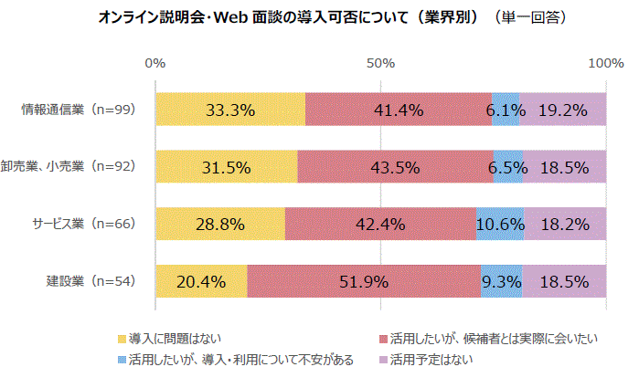 弊社の取引先企業で人事・採用担当者の方を対象に「オンライン説明会・Web面談の導入について」質問したところ、28.4%が「導入に問題はない」と回答があった一方で、最も多い回答は「活用したいが、実際に会いたい」(40.7%)となり、採用活動をオンラインで実施することに抵抗感があることもわかりました。 企業規模別で見ると従業員1000名以上の企業では「導入に問題ない」という回答が40.7%に対し、従業員1000名未満の企業では25.9%と大企業の方が、オンライン説明会・Web面談の導入に前向きな傾向がわかりました。また、業界別に比較すると「情報通信業」は、他の業界よりも導入への抵抗感が少ないことがわかりました。