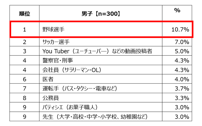 男子の1位は「野球選手」、女子の1位は「パティシエ」