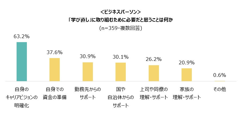 「今後働いていくうえで『学び直し』が必要だと思うが、現在取り組んではいない」と回答したビジネスパーソン359人とフリーランサー185人に対し、「『学び直し』に取り組むために、必要だと思うことは何か」と質問したところ、ビジネスパーソンがトップに挙げたのは「自身のキャリアビジョンの明確化」(63.2%)でした。これに対し、フリーランサーがトップに挙げたのは、「自身での資金の準備」(56.2%)でした。