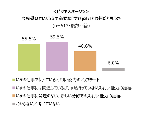 *2:本調査では「学び直し」を「変化の激しい現代の社会に対応して、個々の働き手がより付加価値の高い仕事にシフトしていくため、新たなスキルや能力を習得していくこと」と定義し、この定義を回答者へ提示したうえで調査を行っています。