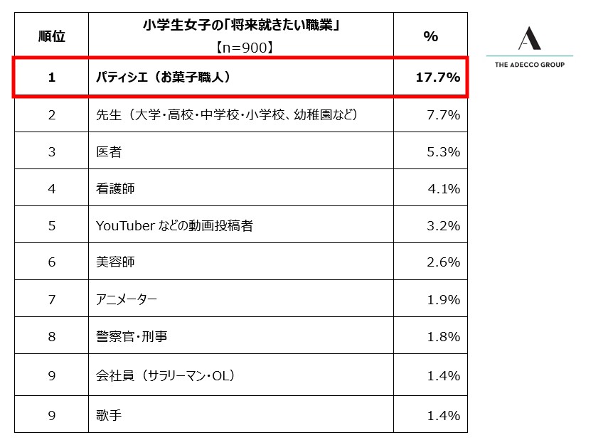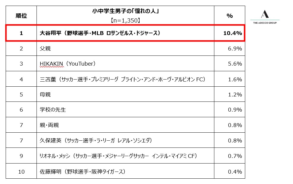 人財サービスのグローバルリーダーであるAdecco Groupの日本法人で、総合人事・人財サービスを展開するアデコ株式会社(本社:東京都千代田区、代表取締役社長:平野 健二)は、この度、日本全国の小中学生2,700人(各学年男女150人ずつ)を対象に、「将来就きたい職業」と「憧れの人」に関する調査を実施しました。「将来就きたい職業」は単一選択式、「憧れの人」は単一自由回答式とし、それぞれ回答を収集しました。